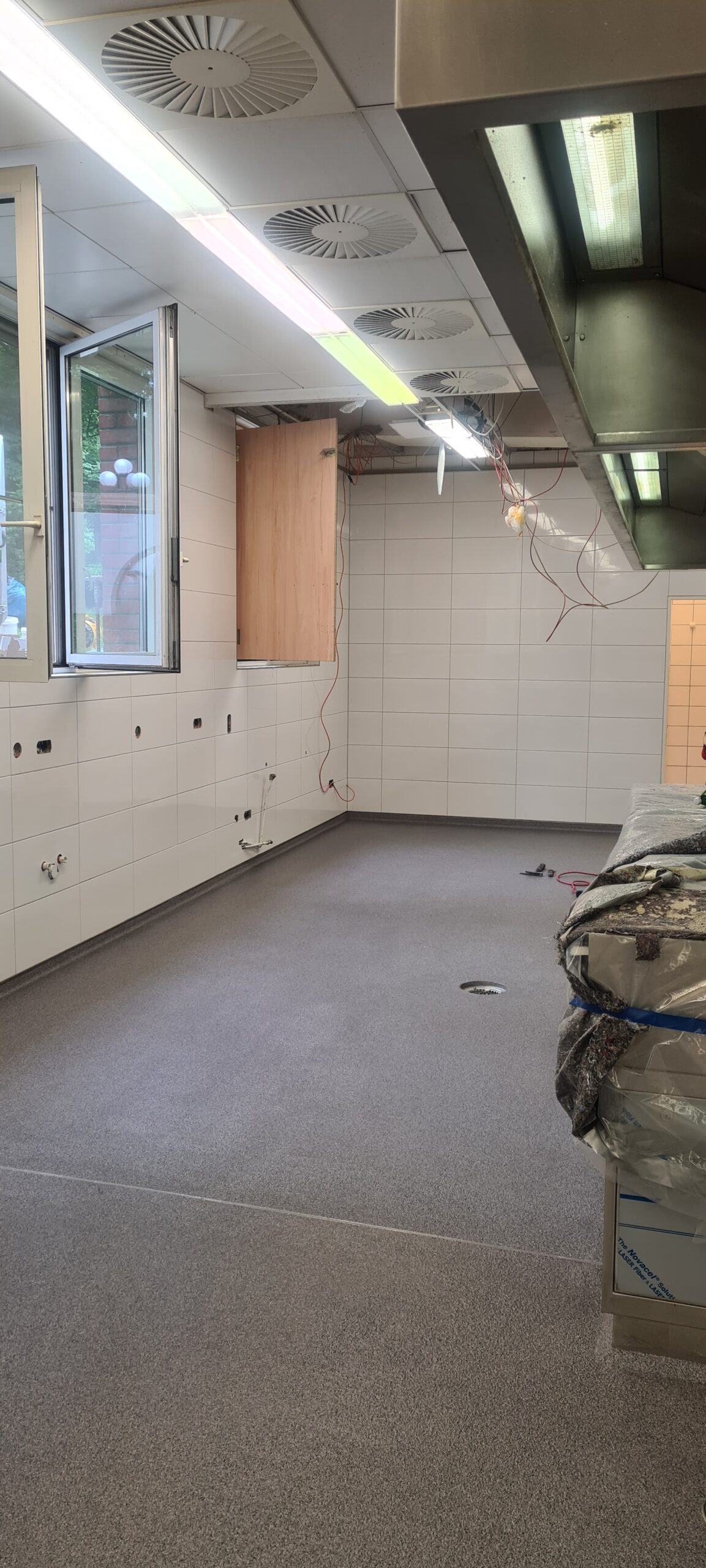 die Fotos sprechen Bände: Der Küchenboden inklusive fugenloser Kunstharzbeschichtung gegen Fett und Feuchtigkeit ist vollständig eingebaut. Die Hamburger Spezialfirma Kröger und Sohn hat sehr gute Arbeit geleistet und trotz der hohen Innentemperaturen schnell und sauber den Belag mit eingestreutem Granulat in Rekordzeit eingebracht. Vor allem der Abschluss/Übergang zur Wandfliese ist optimal gelungen und verspricht bei zukünftiger täglicher Reinigung langlebige Isolation der Wandflächen und Übergänge.
